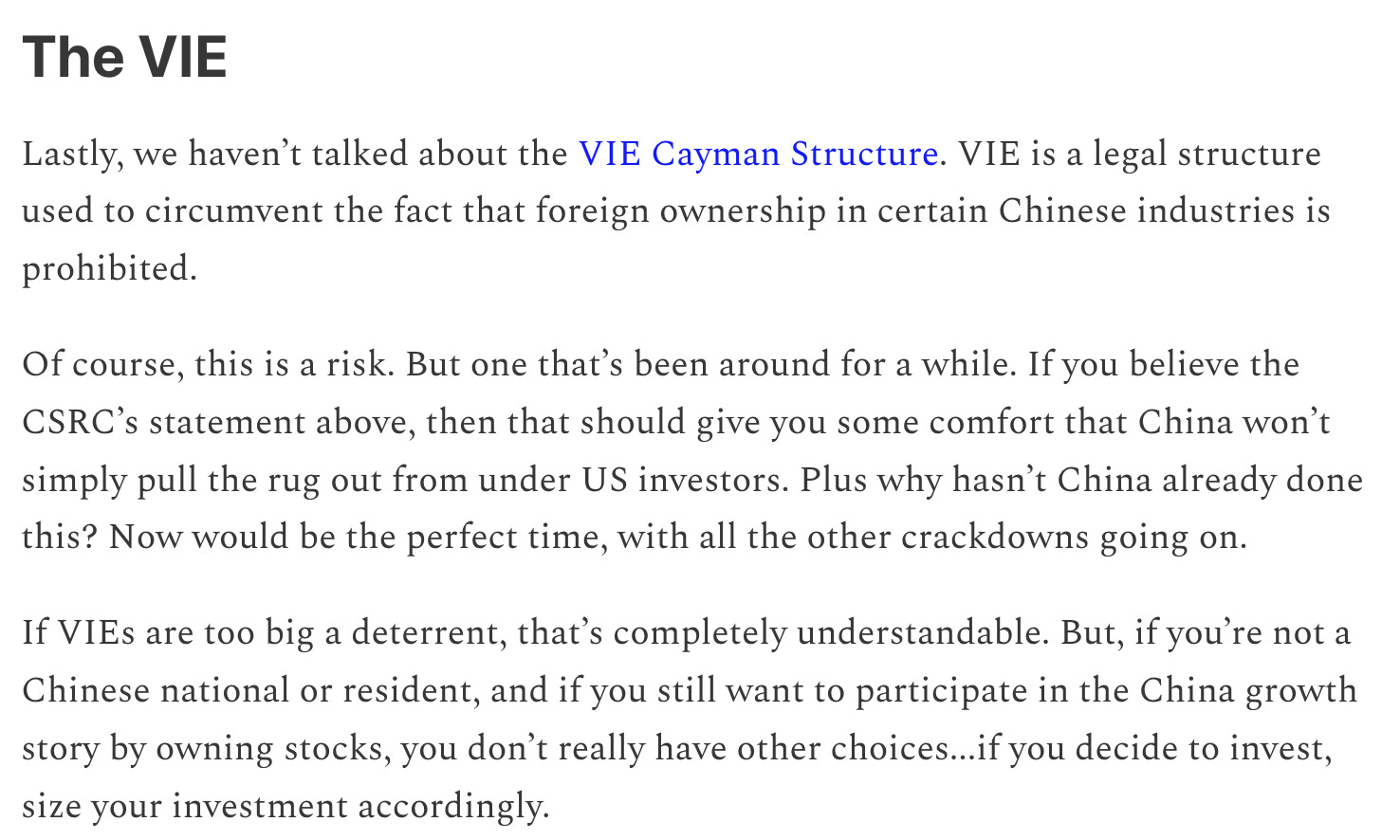 The VIE complicates company ownership. But hey, if the VIE isn’t a deal breaker for folks like David Tepper and Michael Burry, ones with billions to evaluate the risk of such a structure, why should I worry about this?