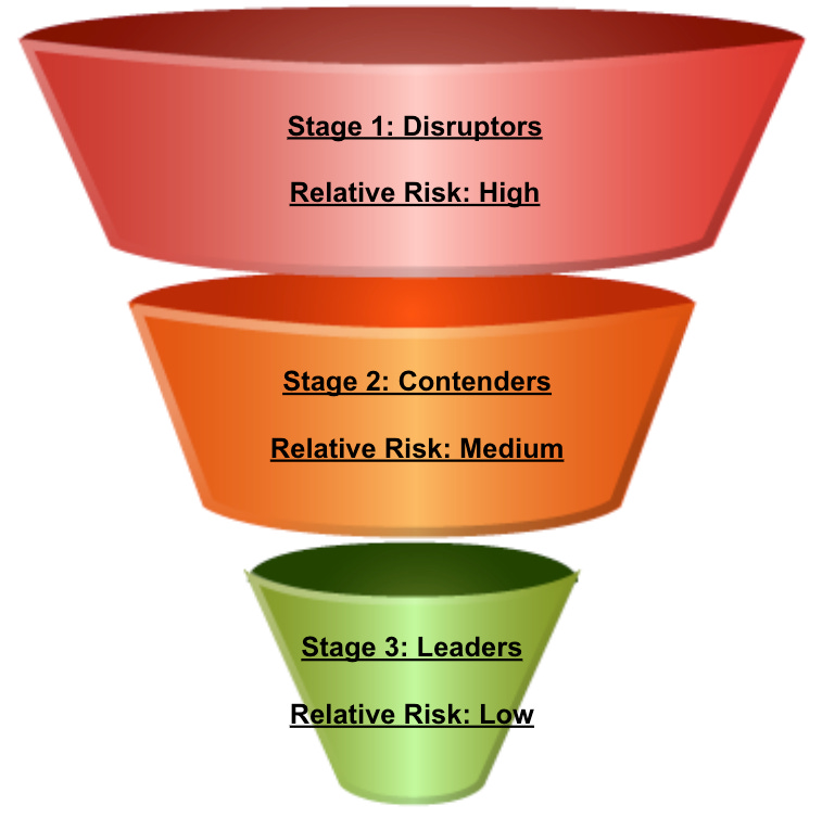 After Disruptors have demonstrated initial success, they graduate to Stage 2 to become what I call Contenders. I believe Stage 2 is the most dangerous of the 3 stages. Valuations are high. Expectations are high. And lastly, if they haven’t already done so, Competition is taking direct aim. As a result, investing only in Contenders may in fact be a recipe for failure. Because of the failure rate, the expected value of a portfolio of such companies may not be positive.