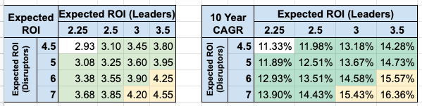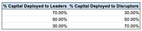 Let’s assume we invest in Disruptors and Leaders, but not Contenders. Then,