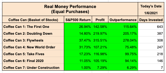 With that said, it’s been 643 days since I first started sharing my Stock Baskets (Coffee Cans). I certainly didn’t expect this hit-rate. For now, I’ll take it, but only time will tell whether these were good investments. Recall, unless I see a drastic change in their underlying businesses, each of these Coffee Cans are expected to be held for at least 3-5 years.